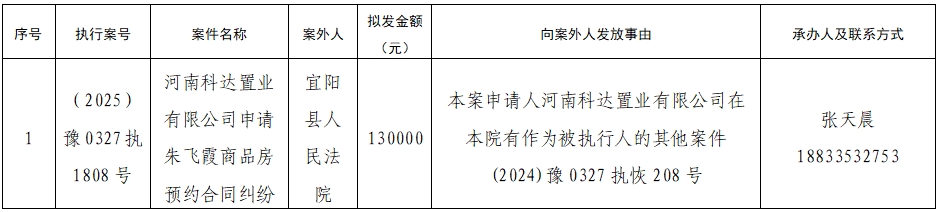 为进一步加强执行案款管理,规范执行案款发放程序,保障当事人合法权益,根据《最高人民法院关于执行款物管理工作的规定》等相关规定要求,现将本院拟向案外人发放执行案款的情况予以公示,公示期为三个自然日(2025年9月20日-2025年9月22日)。案件当事人或其他利害关系如有异议,应当在公示期内向执行人员提交书面意见及相关证据材料。公示期满无异议的,本院将按照执行案款管理规定办理案款发放。