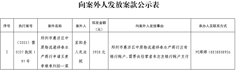 为进一步规范执行案款收发、管理,完善执行案款管理工作,维护当事人合法权益,防患廉政风险,现将本院拟向案外人发放执行案款的情况予以公示,案件当事人或其他利害关系如有异议,应当在公示期内向执行人员提交书面意见及相关证据材料。公示期满3个自然日后如无人提出异议,本院将按照执行案款管理规定办理案款发放。