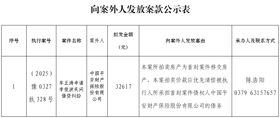 为进一步规范执行案款收发、管理,完善执行案款管理工作,维护当事人合法权益,防患廉政风险,现将本院拟向案外人发放执行案款的情况予以公示,案件当事人或其他利害关系如有异议,应当在公示期内向执行人员提交书面意见及相关证据材料。公示期满3个自然日后如无人提出异议,本院将按照执行案款管理规定办理案款发放。