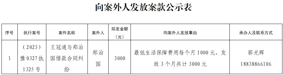为进一步规范执行案款收发、管理,完善执行案款管理工作,维护当事人合法权益,防患廉政风险,现将本院拟向案外人发放执行案款的情况予以公示,案件当事人或其他利害关系如有异议,应当在公示期内向执行人员提交书面意见及相关证据材料。公示期满3个自然日后如无人提出异议,本院将按照执行案款管理规定办理案款发放。