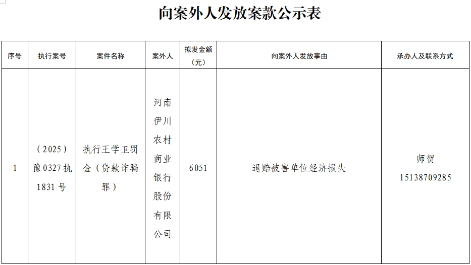 为进一步规范执行案款收发、管理,完善执行案款管理工作,维护当事人合法权益,防患廉政风险,现将本院拟向案外人发放执行案款的情况予以公示,案件当事人或其他利害关系如有异议,应当在公示期内向执行人员提交书面意见及相关证据材料。公示期满3个自然日后如无人提出异议,本院将按照执行案款管理规定办理案款发放。