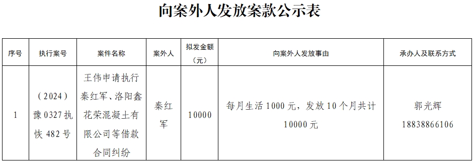 为进一步规范执行案款收发、管理,完善执行案款管理工作,维护当事人合法权益,防患廉政风险,现将本院拟向案外人发放执行案款的情况予以公示,案件当事人或其他利害关系如有异议,应当在公示期内向执行人员提交书面意见及相关证据材料。公示期满3个自然日后如无人提出异议,本院将按照执行案款管理规定办理案款发放。