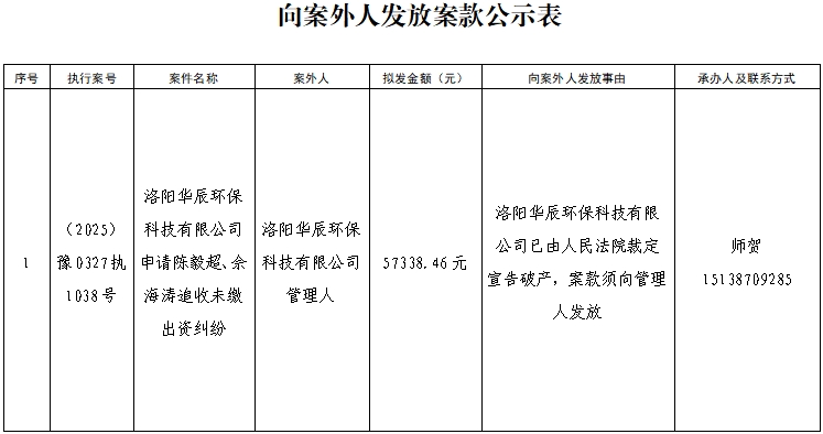 为进一步规范执行案款收发、管理,完善执行案款管理工作,维护当事人合法权益,防患廉政风险,现将本院拟向案外人发放执行案款的情况予以公示,案件当事人或其他利害关系如有异议,应当在公示期内向执行人员提交书面意见及相关证据材料。公示期满3个自然日后如无人提出异议,本院将按照执行案款管理规定办理案款发放。