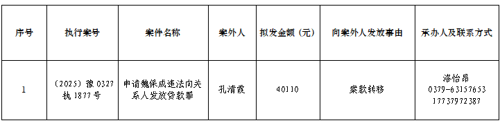 为进一步规范执行案款收发、管理,完善执行案款管理工作,维护当事人合法权益,防患廉政风险,现将本院拟向案外人发放执行案款的情况予以公示,案件当事人或其他利害关系如有异议,应当在公示期内向执行人员提交书面意见及相关证据材料。公示期满3个自然日后如无人提出异议,本院将按照执行案款管理规定办理案款发放。