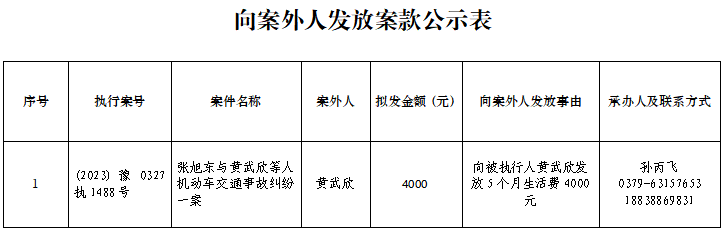 为进一步规范执行案款收发、管理,完善执行案款管理工作,维护当事人合法权益,防患廉政风险,现将本院拟向案外人发放执行案款的情况予以公示,案件当事人或其他利害关系如有异议,应当在公示期内向执行人员提交书面意见及相关证据材料。公示期满3个自然日后如无人提出异议,本院将按照执行案款管理规定办理案款发放。