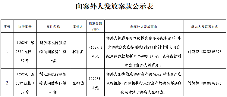为进一步规范执行案款收发、管理,完善执行案款管理工作,维护当事人合法权益,防患廉政风险,现将本院拟向案外人发放执行案款的情况予以公示,案件当事人或其他利害关系如有异议,应当在公示期内向执行人员提交书面意见及相关证据材料。公示期满3个自然日后如无人提出异议,本院将按照执行案款管理规定办理案款发放。