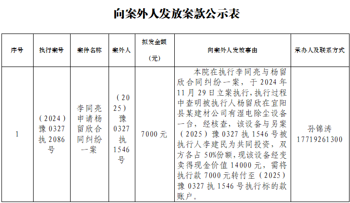 为进一步规范执行案款收发、管理,完善执行案款管理工作,维护当事人合法权益,防患廉政风险,现将本院拟向案外人发放执行案款的情况予以公示,案件当事人或其他利害关系如有异议,应当在公示期内向执行人员提交书面意见及相关证据材料。公示期满3个自然日后如无人提出异议,本院将按照执行案款管理规定办理案款发放。