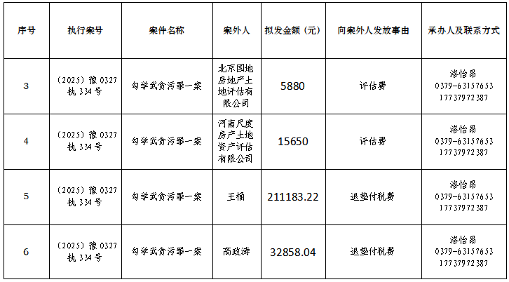 为进一步规范执行案款收发、管理,完善执行案款管理工作,维护当事人合法权益,防患廉政风险,现将本院拟向案外人发放执行案款的情况予以公示,案件当事人或其他利害关系如有异议,应当在公示期内向执行人员提交书面意见及相关证据材料。公示期满3个自然日后如无人提出异议,本院将按照执行案款管理规定办理案款发放。
