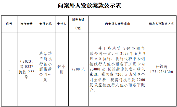 为进一步规范执行案款收发、管理,完善执行案款管理工作,维护当事人合法权益,防患廉政风险,现将本院拟向案外人发放执行案款的情况予以公示,案件当事人或其他利害关系如有异议,应当在公示期内向执行人员提交书面意见及相关证据材料。公示期满3个自然日后如无人提出异议,本院将按照执行案款管理规定办理案款发放。