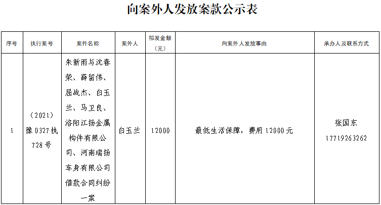 为进一步规范执行案款收发、管理,完善执行案款管理工作,维护当事人合法权益,防患廉政风险,现将本院拟向案外人发放执行案款的情况予以公示,案件当事人或其他利害关系如有异议,应当在公示期内向执行人员提交书面意见及相关证据材料。公示期满3个自然日后如无人提出异议,本院将按照执行案款管理规定办理案款发放。