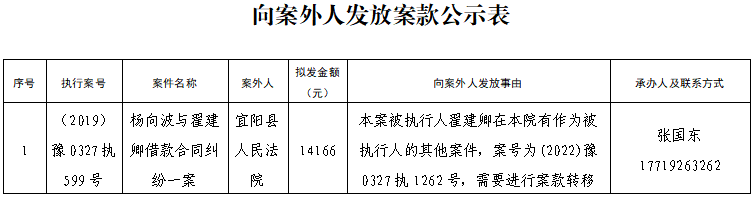公示 | 宜阳县人民法院关于向案外人发放案款案件的公示