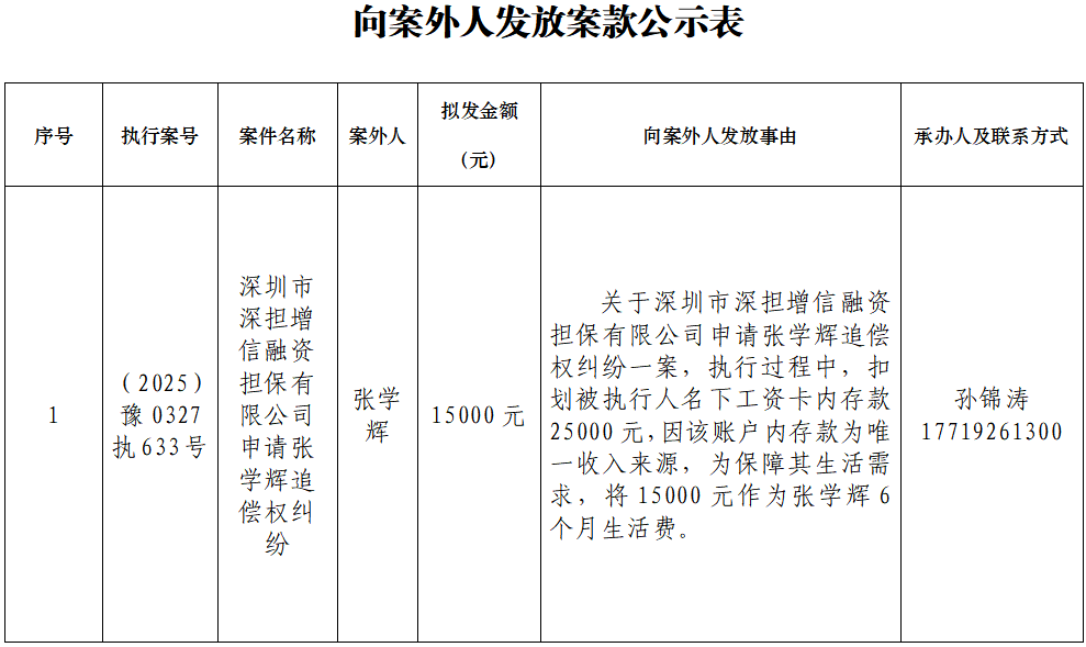 为进一步规范执行案款收发、管理,完善执行案款管理工作,维护当事人合法权益,防患廉政风险,现将本院拟向案外人发放执行案款的情况予以公示,案件当事人或其他利害关系如有异议,应当在公示期内向执行人员提交书面意见及相关证据材料。公示期满3个自然日后如无人提出异议,本院将按照执行案款管理规定办理案款发放。