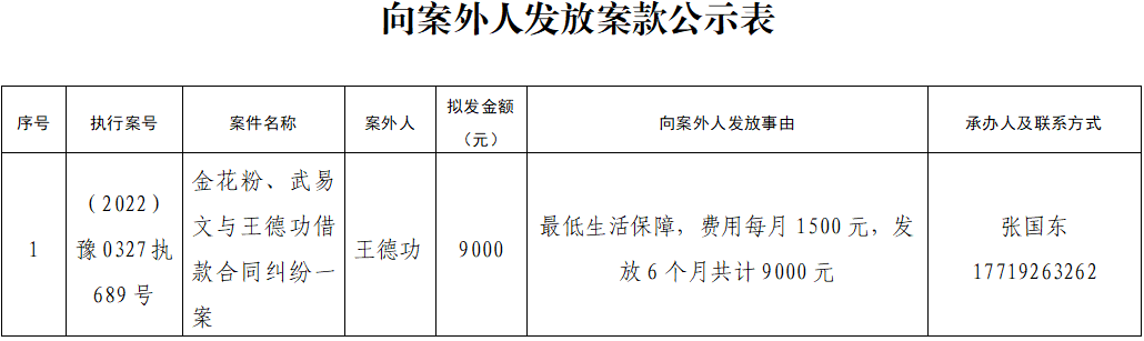 为进一步规范执行案款收发、管理,完善执行案款管理工作,维护当事人合法权益,防患廉政风险,现将本院拟向案外人发放执行案款的情况予以公示,案件当事人或其他利害关系如有异议,应当在公示期内向执行人员提交书面意见及相关证据材料。公示期满3个自然日后如无人提出异议,本院将按照执行案款管理规定办理案款发放。