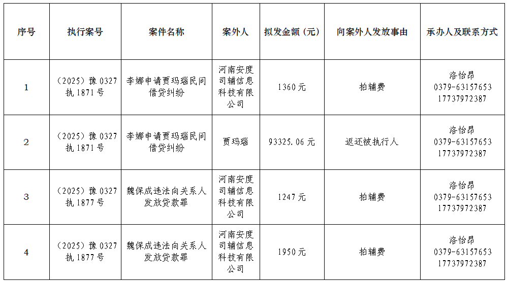 为进一步规范执行案款收发、管理,完善执行案款管理工作,维护当事人合法权益,防患廉政风险,现将本院拟向案外人发放执行案款的情况予以公示,案件当事人或其他利害关系如有异议,应当在公示期内向执行人员提交书面意见及相关证据材料。公示期满3个自然日后如无人提出异议,本院将按照执行案款管理规定办理案款发放。