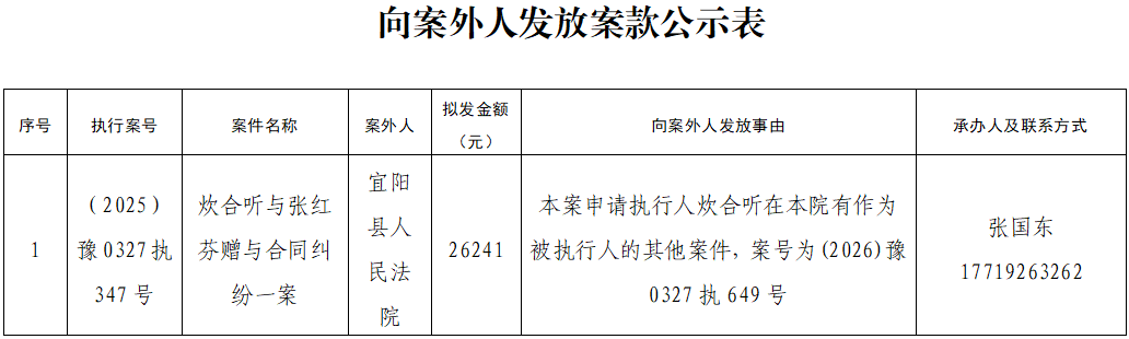 公示 | 宜阳县人民法院关于向案外人发放案款案件的公示